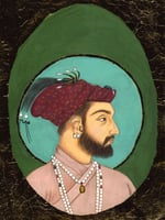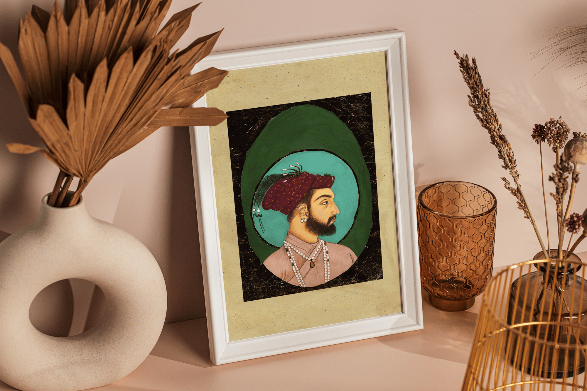 Admire the regal bearing of this Mughal-inspired nobleman, captured in a profile portrait with exquisite detail and a touch of opulence. Inspired by the grandeur of Mughal art and painted in the delicate style reminiscent of Kangra, this piece is a study in elegance.