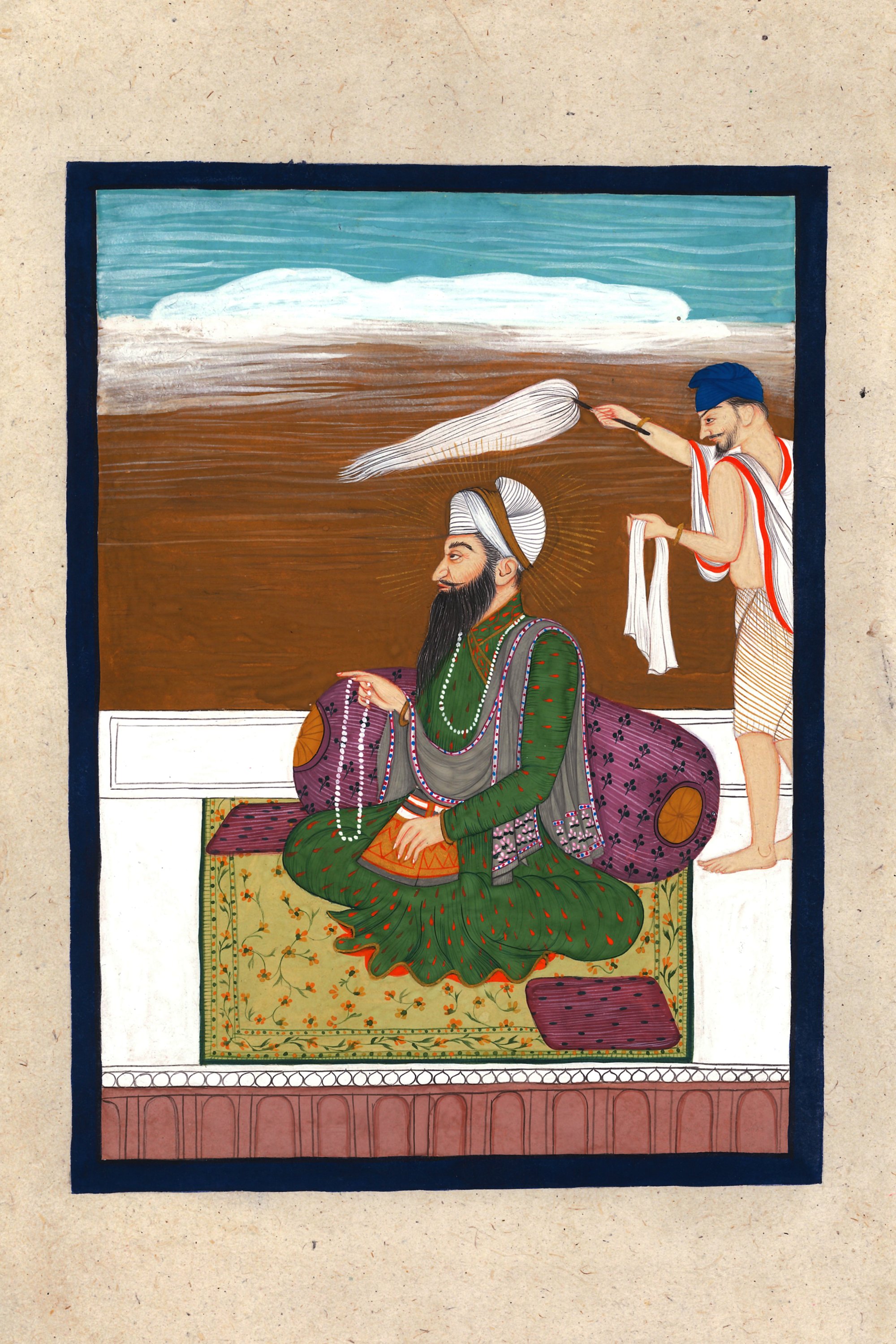 Bring a sense of peace and devotion into your home with this beautiful art print of Guru Ram Das Ji, the fourth Sikh Guru. Painted in the traditional Kangra miniature style, this piece captures the Guru's spirit of humility and selfless service (seva).