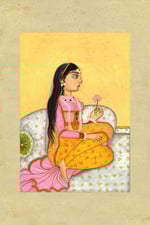 Celebrate the timeless grace of the Nayika, the symbolic heroine of Indian classical literature and art. This beautiful portrait captures her in a moment of quiet contemplation, holding a delicate lotus blossom—a symbol of purity and divine beauty. Rendered in the exquisite miniature style, this piece evokes a sense of poetic serenity and elegance.